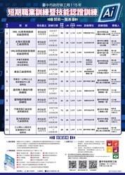 為提升民眾職場能力,拓展第二專長技能,增強職場競爭力,設計辦理短期、單元性、重點式、易懂實作的課程,並培養輔導民眾認證技能的實力。開課資訊請至下方附件下載區下載。