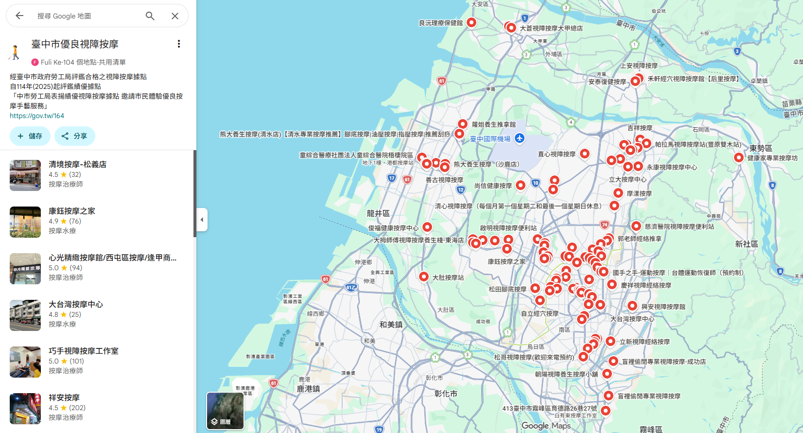 臺中市績優視障按摩據點(114年度)