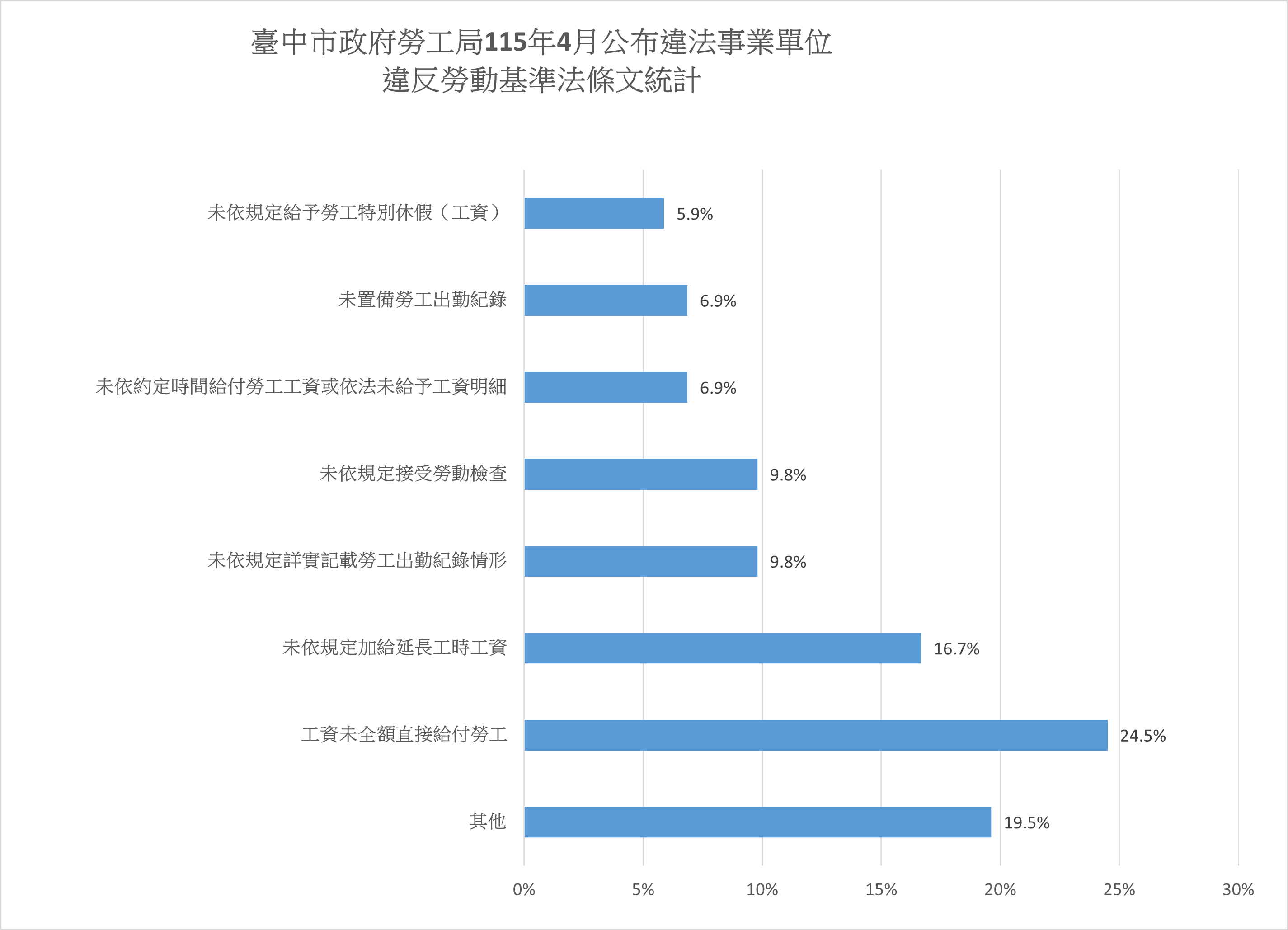 臺中市政府勞工局本次新增公布違法事業單位共計112家,其中違反勞動基準法之裁罰區間為115年3月1日至115年3月31日止之事業單位(含於該區間訴願駁回或不受理之事業單位)共計100家,以製造業違法情形最多;次違反勞工退休金條例之裁罰區間為115年3月1日至115年3月31日止之事業單位共計4家;另違反性別平等工作法之裁罰區間為115年3月1日至115年3月31日之事業單位共計8家;又違反最低工資法之裁罰區間為115年3月1日至115年3月31日止之事業單位共計0家。