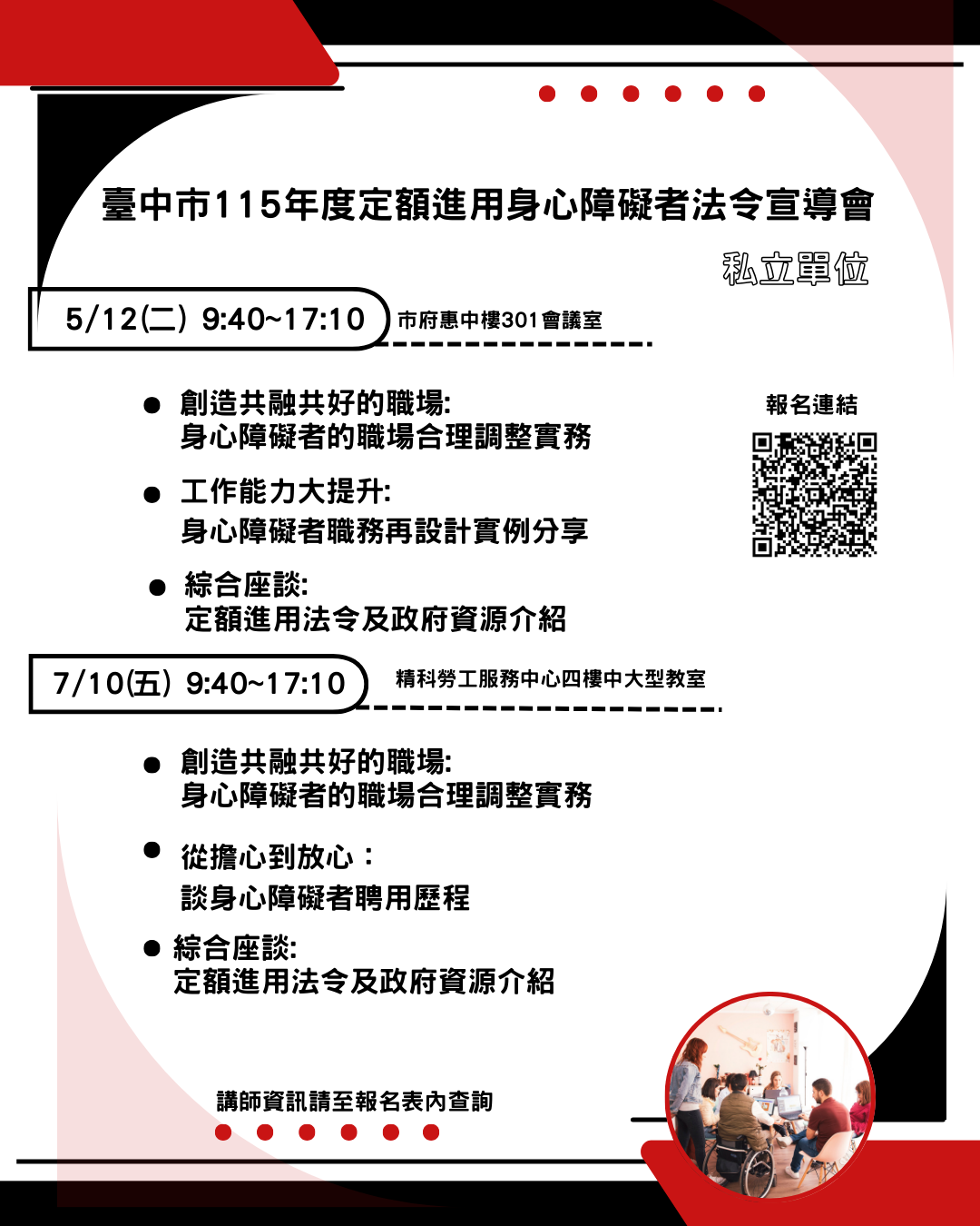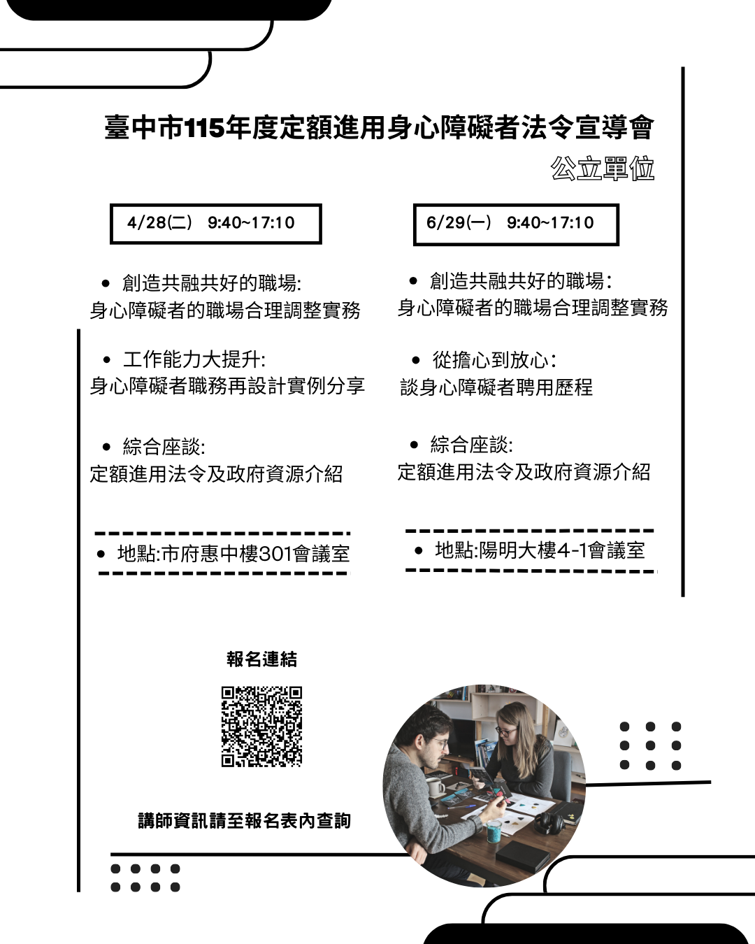 加強事業單位了解進用身心障礙者之相關規定,每年度舉辦定額進用宣導會,歡迎對於本議題有興趣的單位踴躍報名。