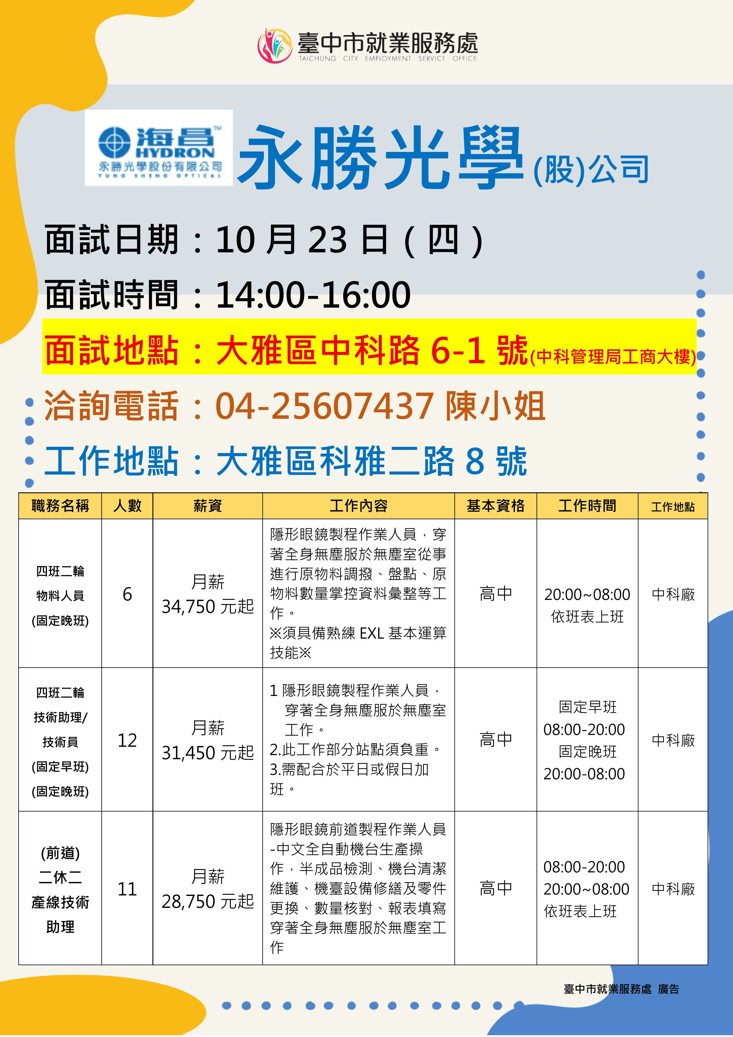10/23(四)永勝光學股份有限公司單一徵才活動