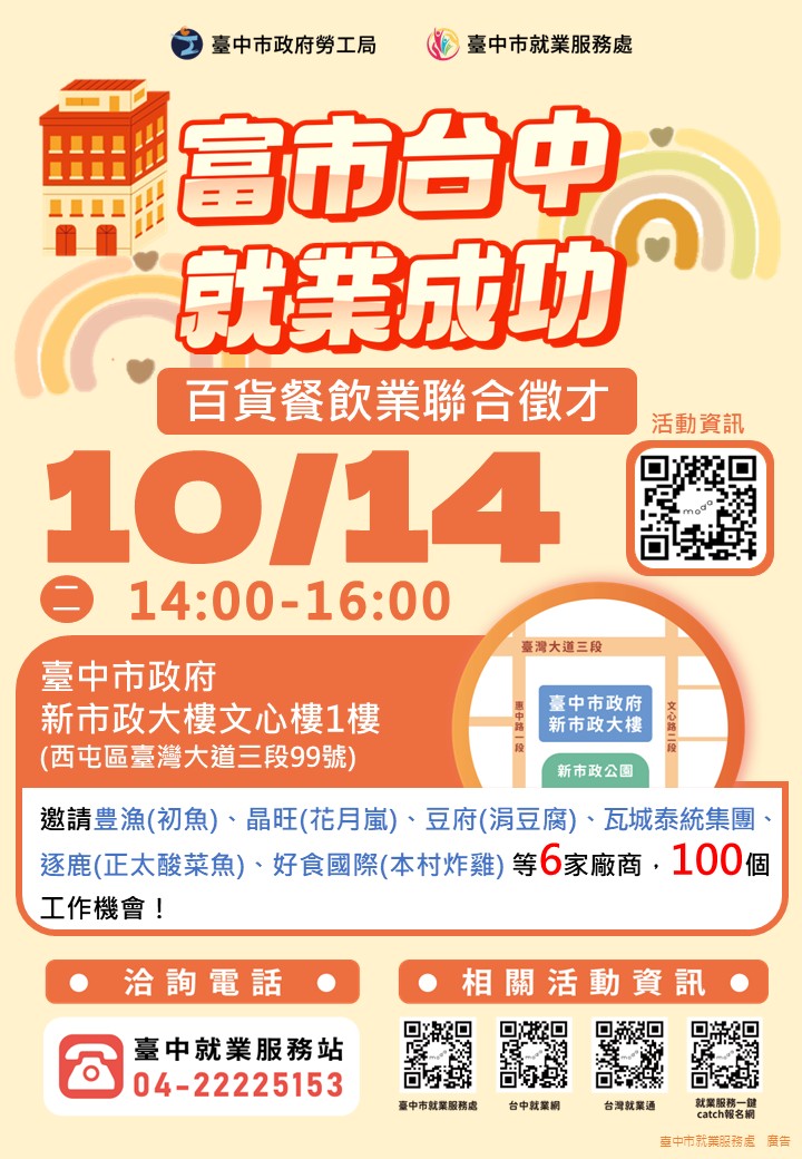 10/14 ( 二 ) 臺中市政府2025「富市台中 就業成功」百貨餐飲業聯合徵才