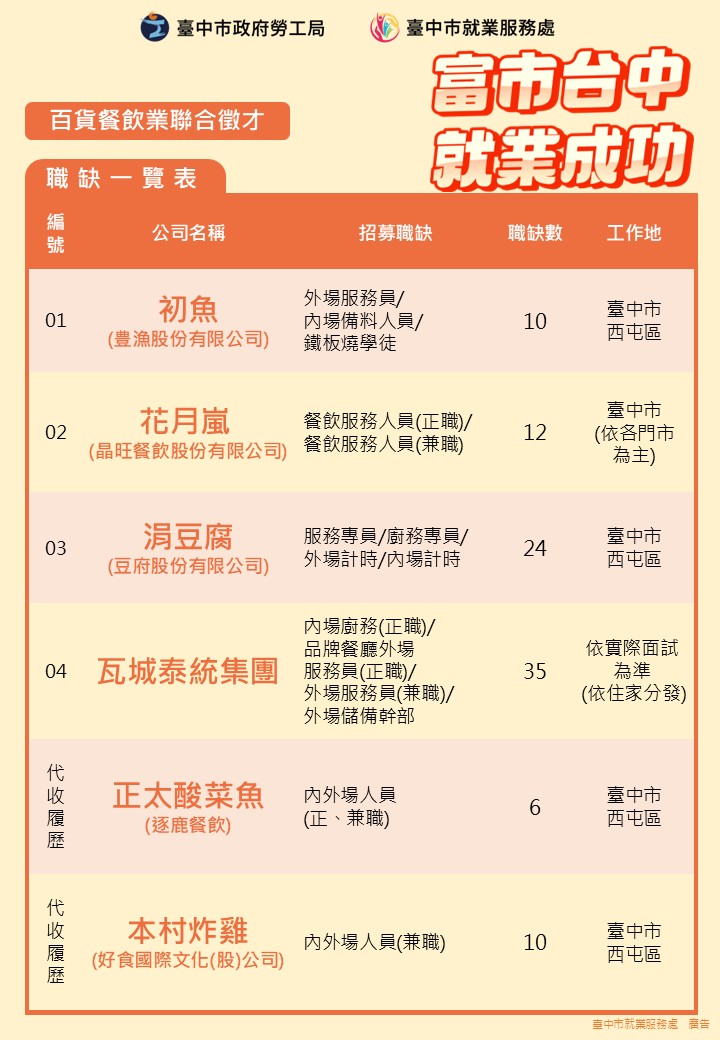邀請初魚集團、花月嵐、豆府餐飲集團及瓦城泰統集團等6廠商,提供100職缺,歡迎求職民眾踴躍參加。