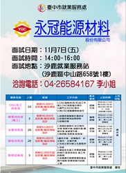 性 質:單一廠商徵才活動 活動日期:11/07(五)14:00-16:00 活動地點:沙鹿就業服務站(沙鹿區中山路658號) 廠商名稱:英屬維京群島商永冠能源材料股份有限公司 廠商地址:臺中市龍井區環港路168號 工作地點:臺中市龍井區環港路168號 職 缺 一:CNC加工技術員(10名) 工作內容:1.CNC鏜銑床(臥式)加工作業。 2.CNC車銑複合操作。 3.龍門立式CNC操作。 4.具CNC經驗願學習者可。 工作時間:早08:00-17:00/晚16:00-24:30/夜24:00-08:30/六、日休(有時週六加班) 基本資格:經驗不拘 薪資待遇︰面議(起薪45,000元,加班費及輪班津貼另計) 職 缺 二:機電技術(電工) (3名) 工作內容:1.生產設備及電力系統的日常維護、保養和維修 工作時間:早08:00-17:00/夜21:00-06:00/週二-周六上班 基本資格:電工經驗 薪資待遇︰面議(起薪46,000元,加班費及輪班津貼另計) 職 缺 三:生產技術員 (20名) 工作內容:1.現場砂模製作、砂芯製作、合模、熔解作業、澆鑄作業、開箱作業、後處理作業。 2.無經驗,肯學習、耐勞者。 工作時間:早08:00-17:00/夜21:00-06:00/週二-周六上班 基本資格:經驗不拘 薪資待遇︰面議(起薪45,000元,加班費及輪班津貼另計) 職 缺 四:鑄造技術員(20名) 工作內容:1鑄件作業,砂模製作、砂芯製作、合模作業。 2.完成主管交辦之生產程序 工作時間:早08:00-17:00/夜21:00-06:00/週二-周六上班 基本資格:經驗不拘 薪資待遇︰面議(起薪45,000元,加班費及輪班津貼另計) 職 缺 五:製程品檢員(3名) 工作內容:1.品檢 2.鑄造各生產工序標準規範的推行,監督各段生 產工序的製程 3.依集團作業標準書對產品進行抽檢,對異常進行記錄、上報 工作時間:早08:00-17:00/夜21:00-06:00/週二-周六上班 基本資格:經驗不拘 薪資待遇︰面議(起薪42,000元,加班費及輪班津貼另計) |