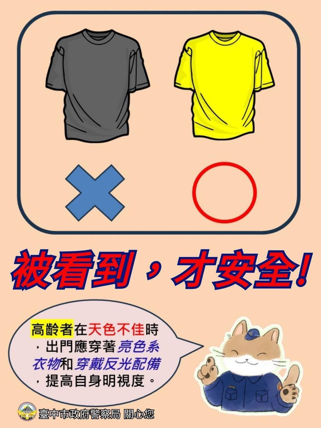 台中市政府為守護銀髮用路安全,推動建置友善、安全、便利、順暢的交通環境,強化道路安全宣導,設置行人及慢速運具安全空間。透過各式場域及媒體管道宣導銀髮族交通安全觀念,建構高齡友善銀髮交通環境。建議長輩穿著鮮豔衣物,夜間或視線不良時盡量減少外出,並使用反光裝置提高能見度。