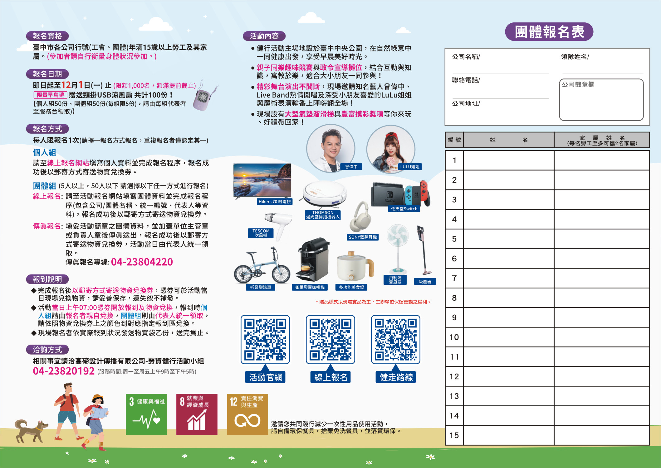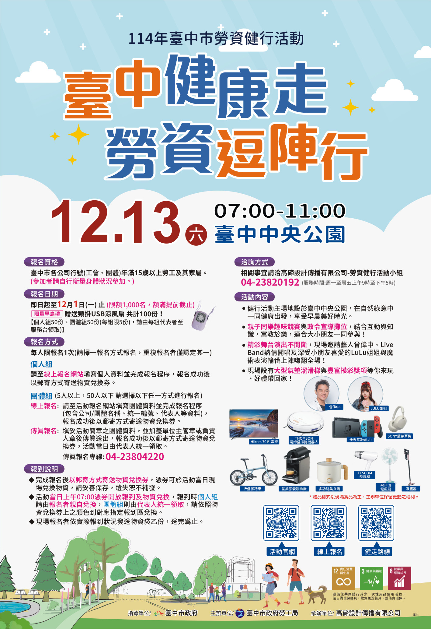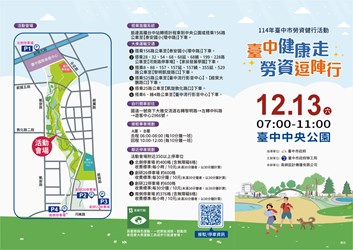 一、本局訂於114年12月13日上午7時至11時於臺中中央公園舉行勞資健行活動,歡迎本市事業單位及勞工朋友共襄盛舉。