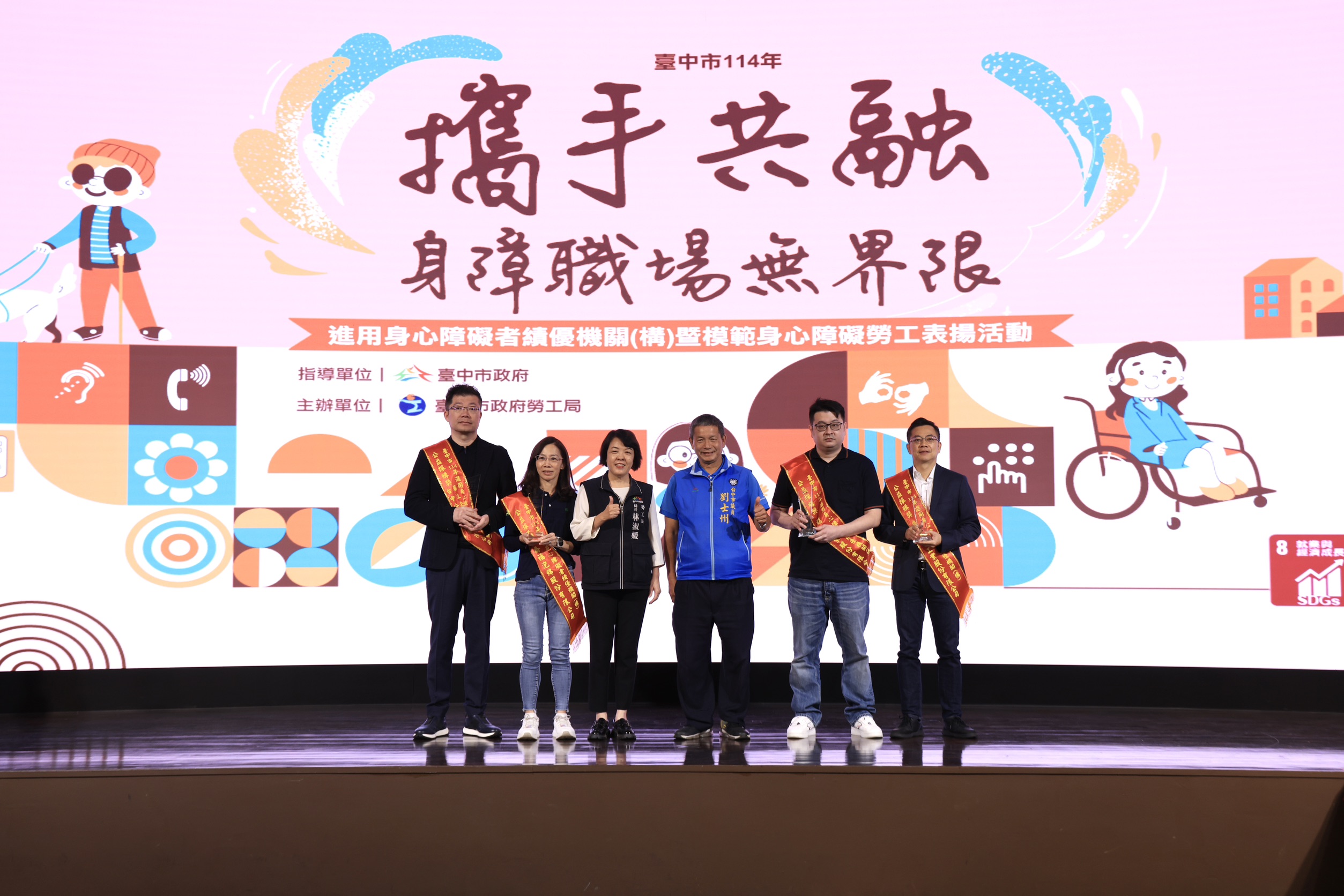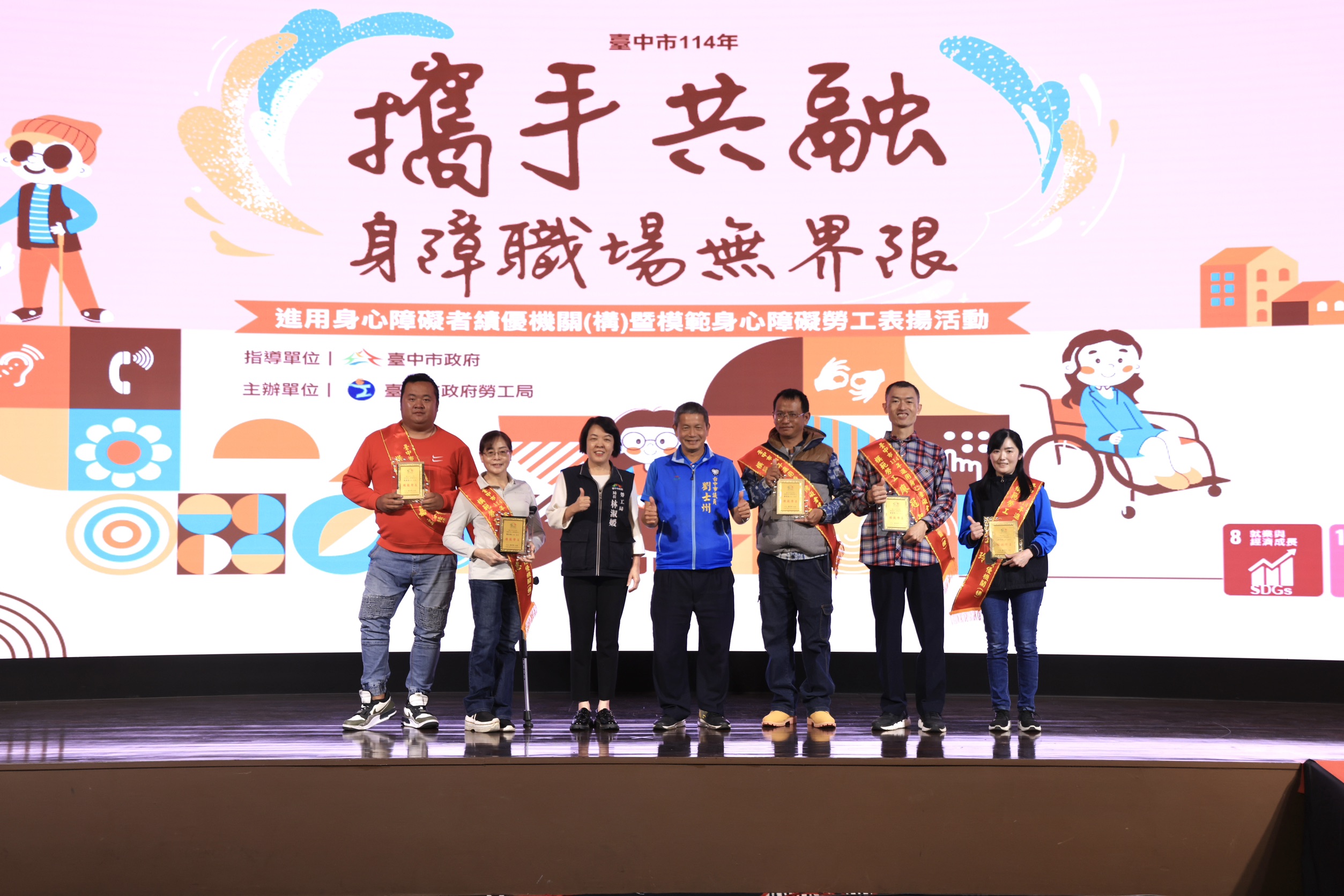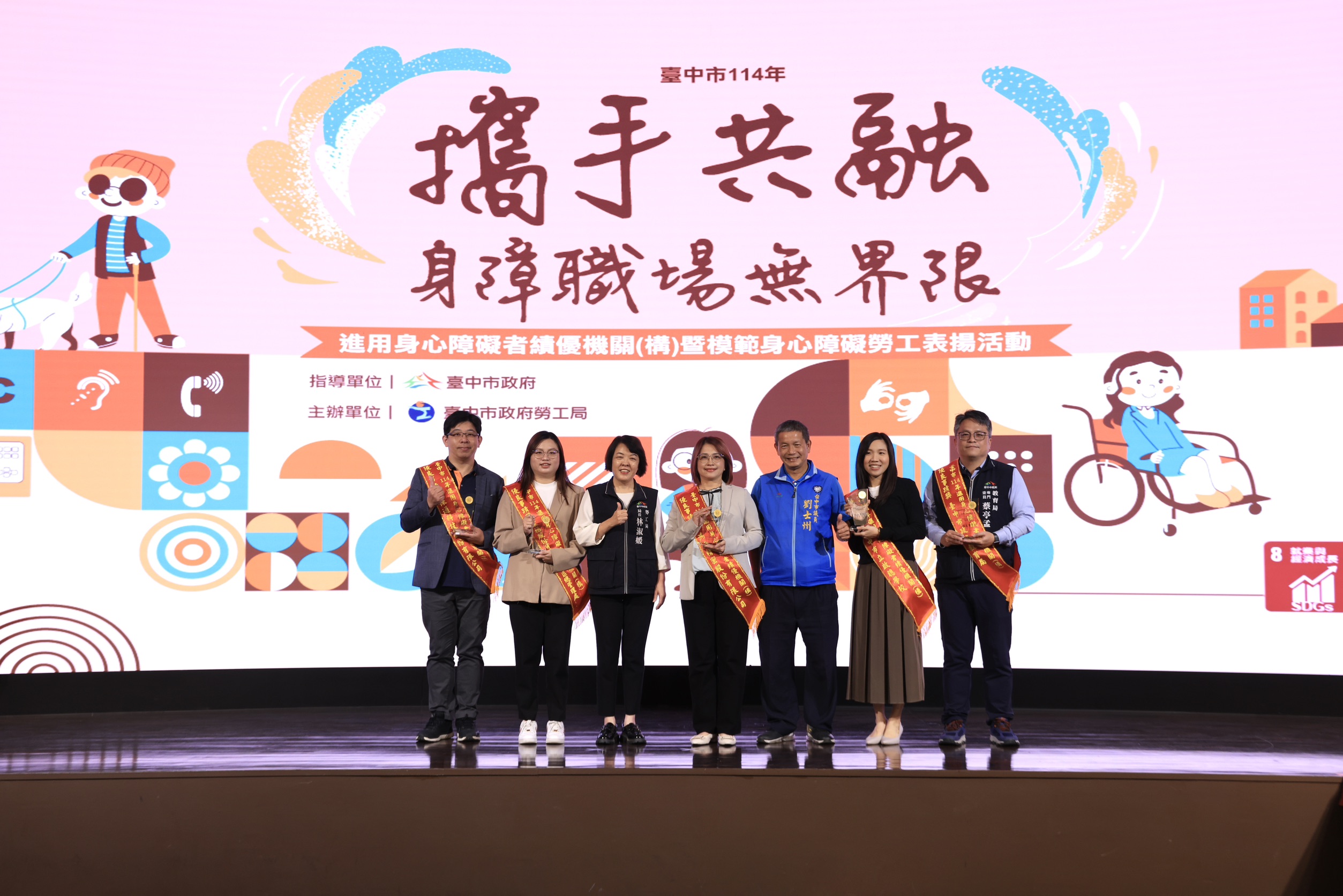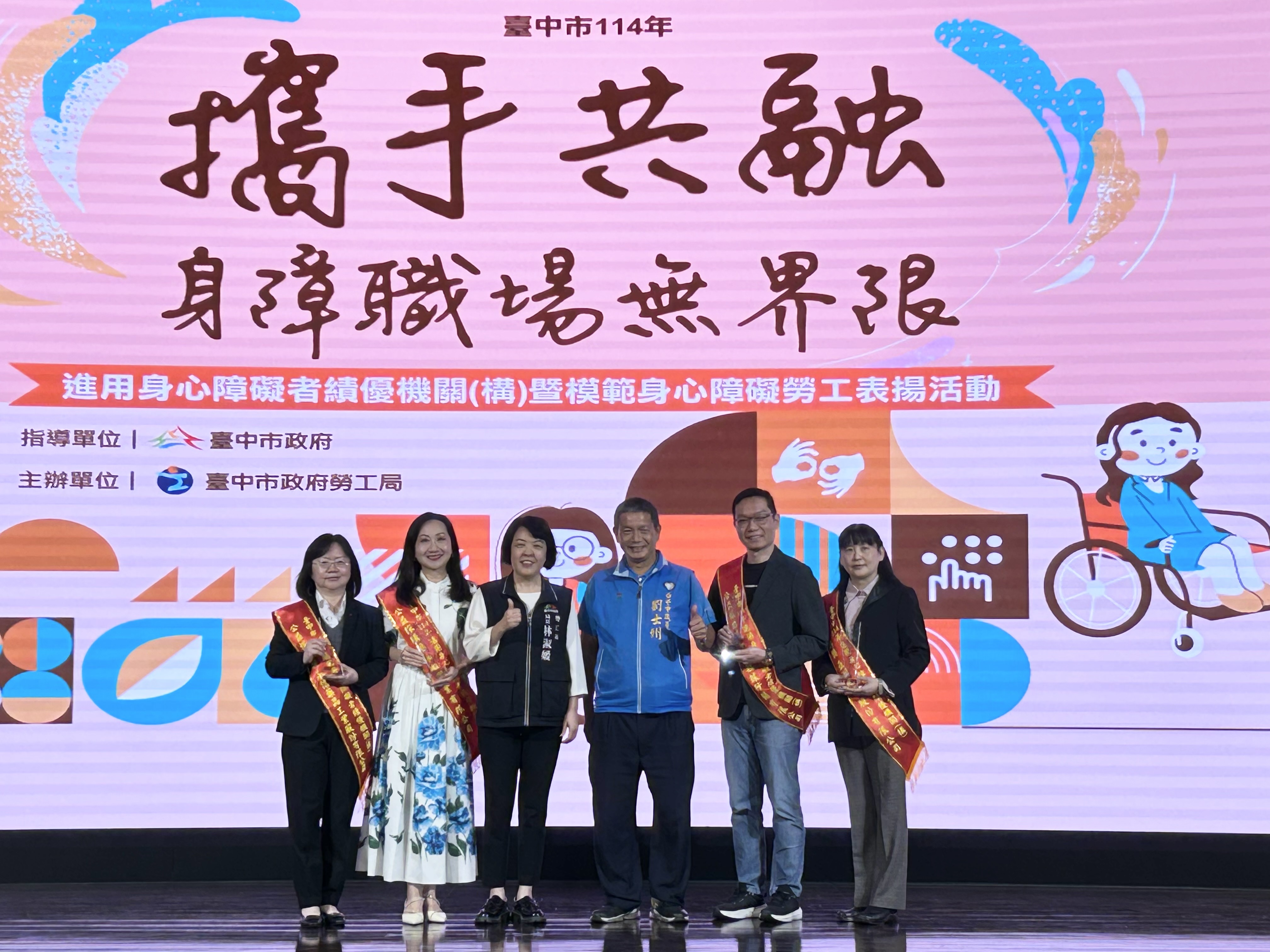 為鼓勵事業單位積極進用身心障礙者,並肯定身障朋友在職場上的堅持與貢獻,台中市政府勞工局於昨(27)日舉辦「中市114年進用身心障礙者績優機關(構)暨模範身心障礙勞工表揚活動」,頒發包括楷模獎1名、優良事蹟獎10名、模範身心障礙勞工10名、公益採購獎10名,以及職場體驗友善廠商3名,共計34個單位及個人獲獎,場面溫馨感人。