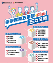 台中市就業服務處說明,銀髮人才服務據點除提供一般求職與求才服務外,也同步推動「樂齡就業五告讚Plus-五力全開」專案,結合職涯諮詢、就業促進及3C科技應用課程,強化銀髮族職場競爭力,並首創「樂齡就業月月有徵才」活動,每月定期定點邀請至少2家以上友善企業釋出適合職缺,加速媒合、協助銀髮族順利重返勞動市場。