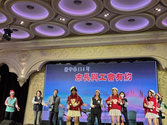 活動現場洋溢濃濃聖誕氣氛,氣氛溫馨熱絡。副秘書長張大春代表市長盧秀燕出席,向工會夥伴表達誠摯感謝,肯定工會長期以來與市府攜手合作、共同為勞工朋友打拚,並與現場貴賓一同為新的一年祈福,展現市府與勞工團體並肩同行、互信互助的夥伴關係。
