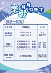 邀請繼光香香雞(香繼光股份有限公司)、家樂福(家福股份有限公司)、康寧居家長照機構等3家廠商,提供50個職缺,歡迎求職民眾踴躍參加。