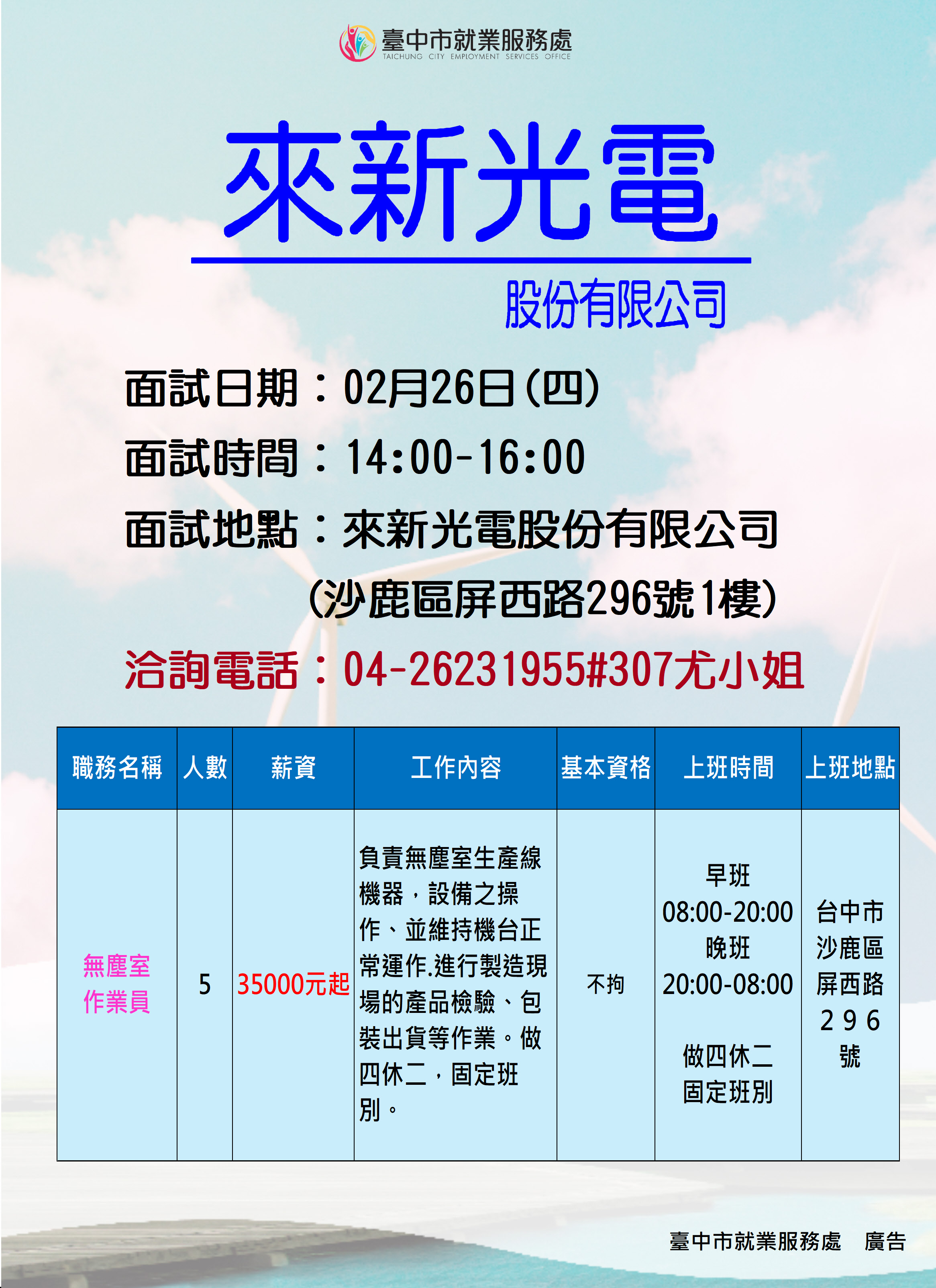 工作內容:負責無塵室生產線機器,設備之操作、並維持機台正常運作.進行製造現場的產品檢驗、包裝出貨等作業。做四休二,固定班別。