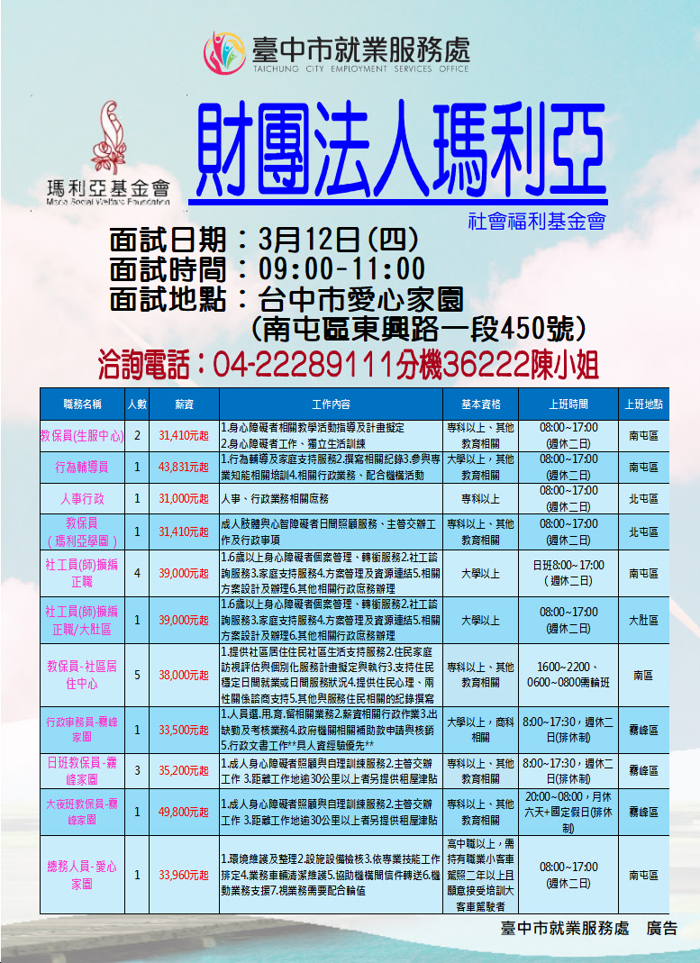 職 缺四:教保員(瑪利亞學園) (1人)