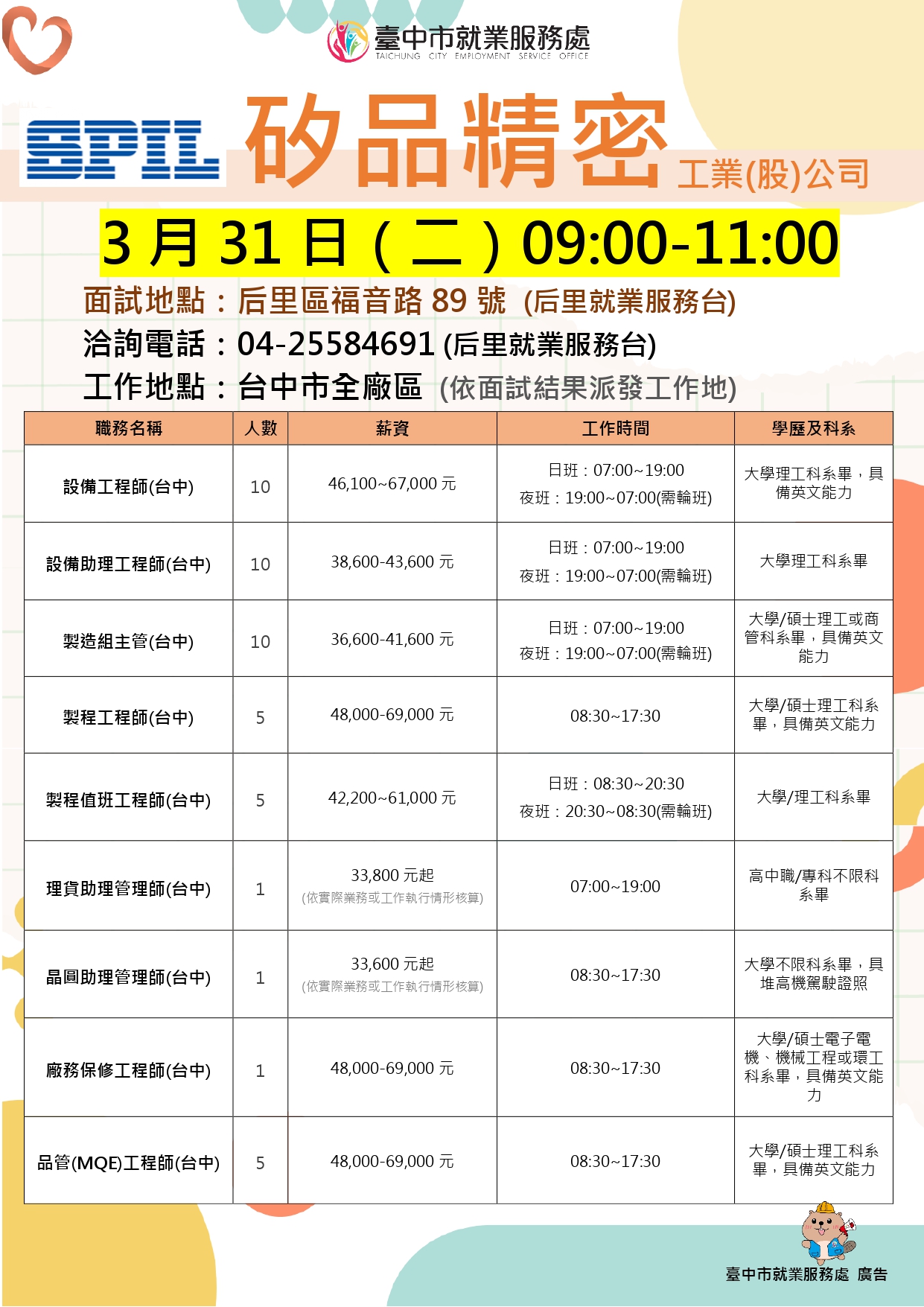 💼工作地點:台中市潭子區大豐路三段123號
