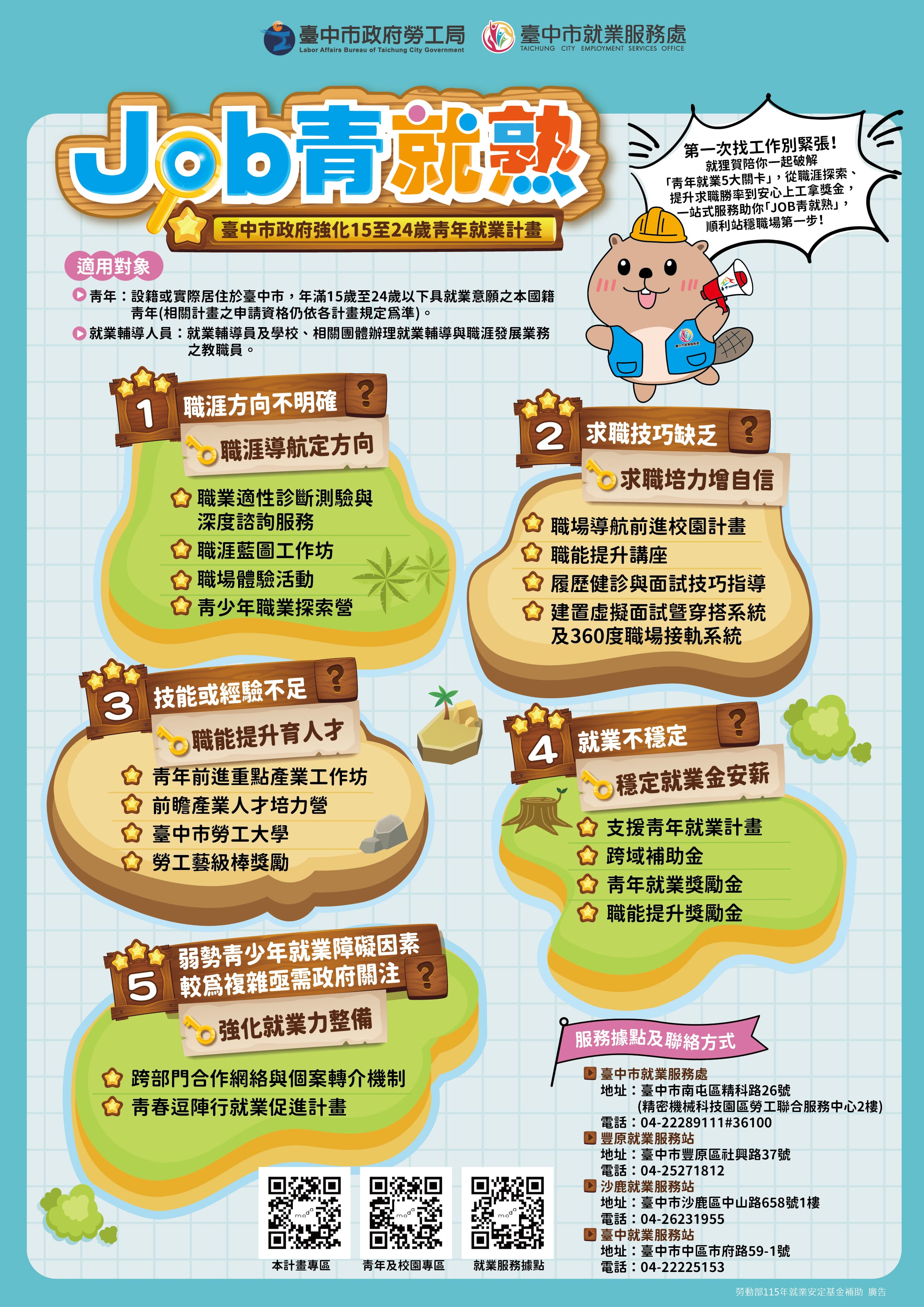 林局長補充,115年除持續推動「青秀樂台中 就業成功」方案外,更針對初次尋職青年推出「Job青就熟-強化15至24歲青年就業計畫」,聚焦職涯導航、求職培力、職能提升、穩定就業及強化就業力五大對策,化解就業障礙。回顧114年,透過各項就業促進方案與徵才措施,已成功協助逾2萬5千名青年順利就業。