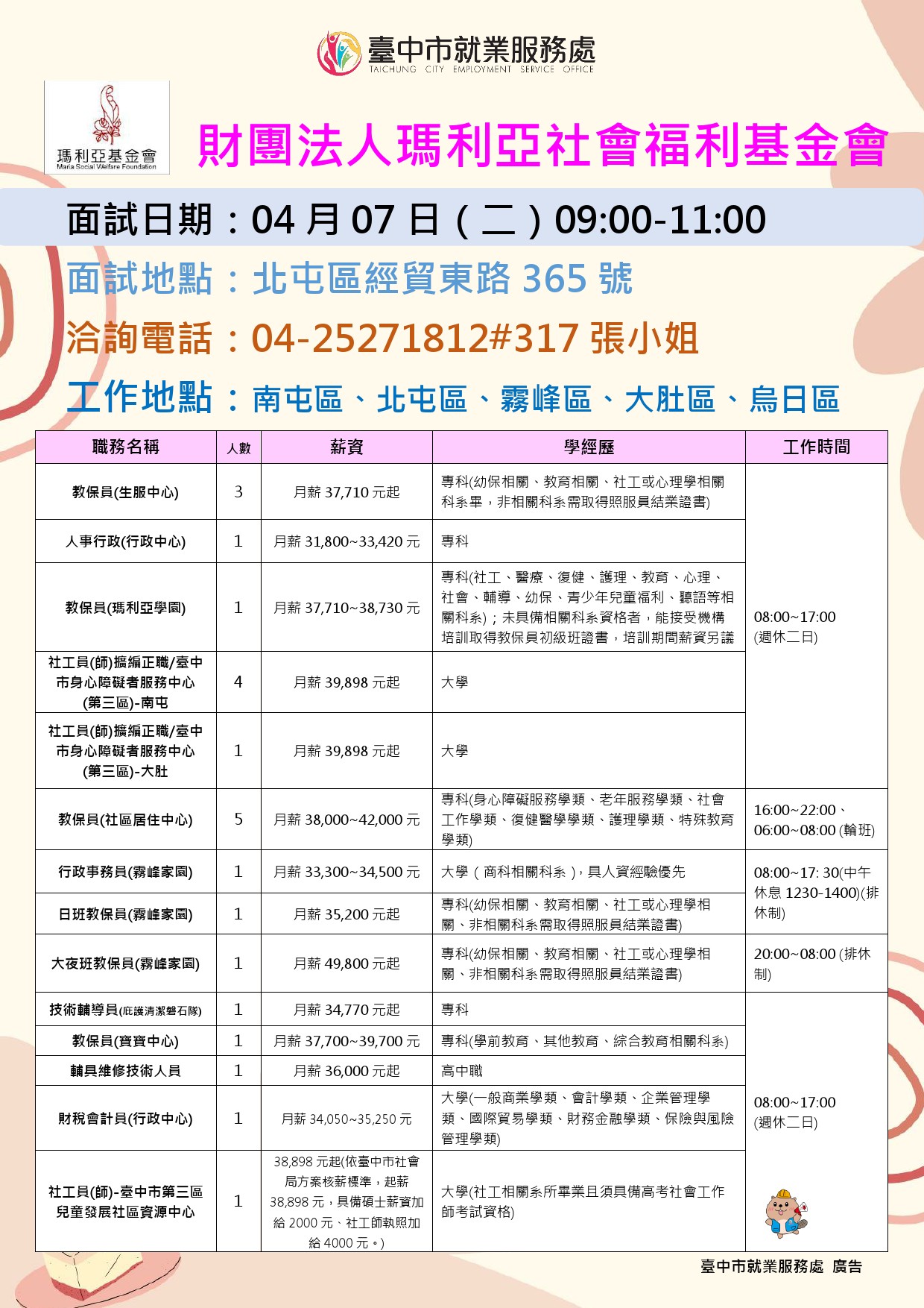 薪資待遇:月薪38,898元起(依臺中市社會局方案核薪標準,起薪38,898元,具備碩士薪資加給2000元、社工師執照加給4000元。)