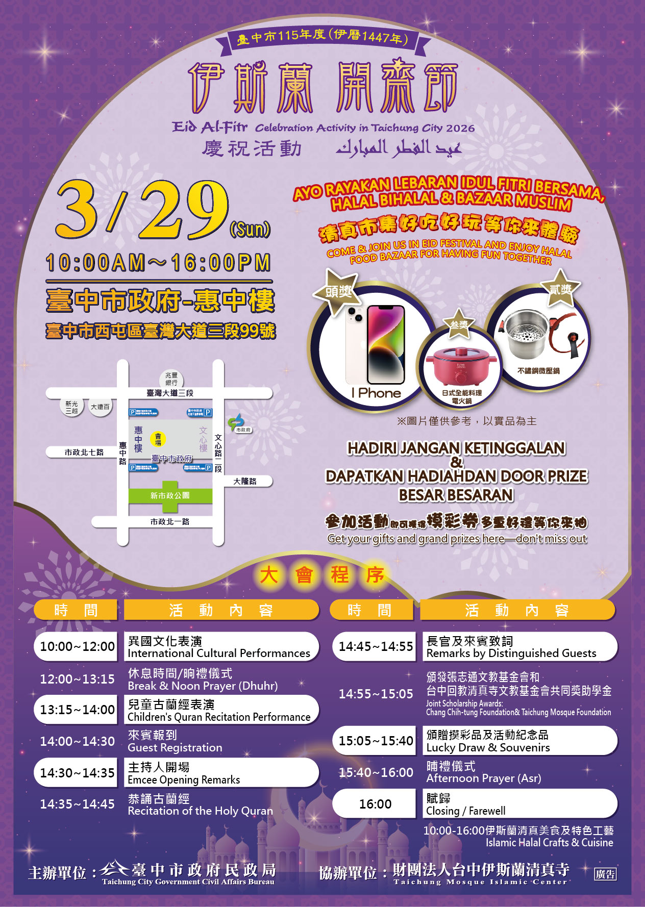 一、本府民政局與財團法人台中伊斯蘭清真寺共同籌辦「臺中市115年度伊斯蘭開齋節慶祝活動」,以文化傳遞與交流為起點,邀請留學生、移工、新住民等朋友一起歡慶齋戒月結束,同時帶領市民瞭解伊斯蘭文化內涵。