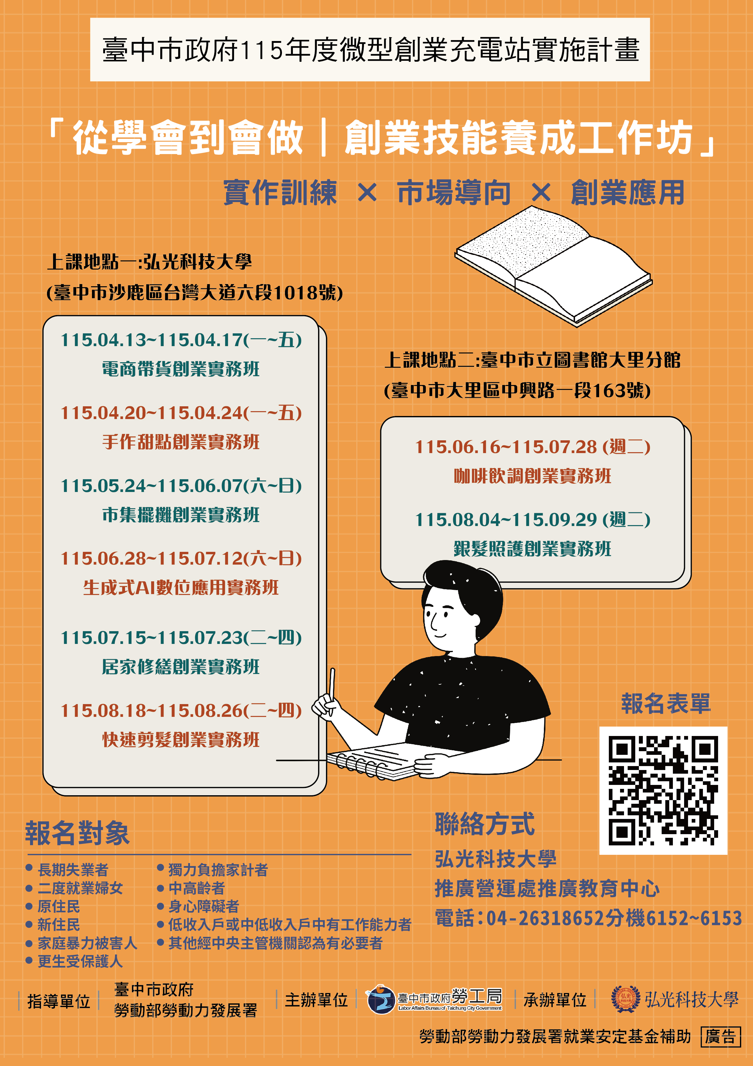勞工局表示,歡迎有創業規劃或正在創業的市民把握機會參與相關課程與輔導服務,115年度活動資訊可至勞工局官網查詢,或電洽04-22289111轉35616洽詢。(4/8*4)*勞工局