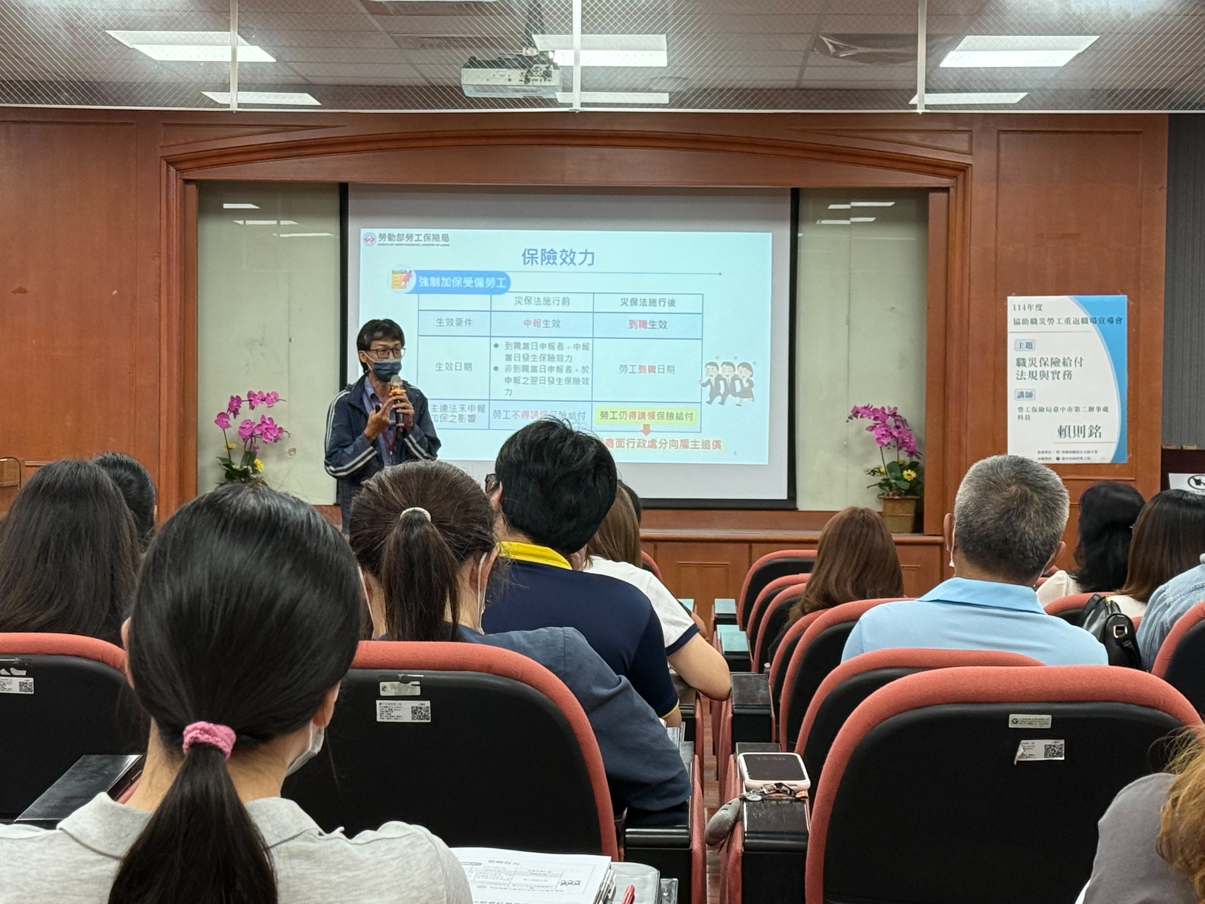 勞工局說明,宣導會課程內容兼顧制度說明與實務分享,上午場次以「掌握資源、經濟支持不中斷」為主軸,介紹協助職業災害勞工重返職場補助辦法的申請流程以及勞工保險局專業解析職災保險給付制度,協助事業單位與勞工了解相關資源並加以運用。下午場次則以「權益保障、專業指引更安心」為主題,邀請執業律師說明相關法律權益,提供專業法律觀點,並由職能復健專責機構分享復健服務與成功案例,協助職災勞工了解復健方向並增強重返職場的信心。