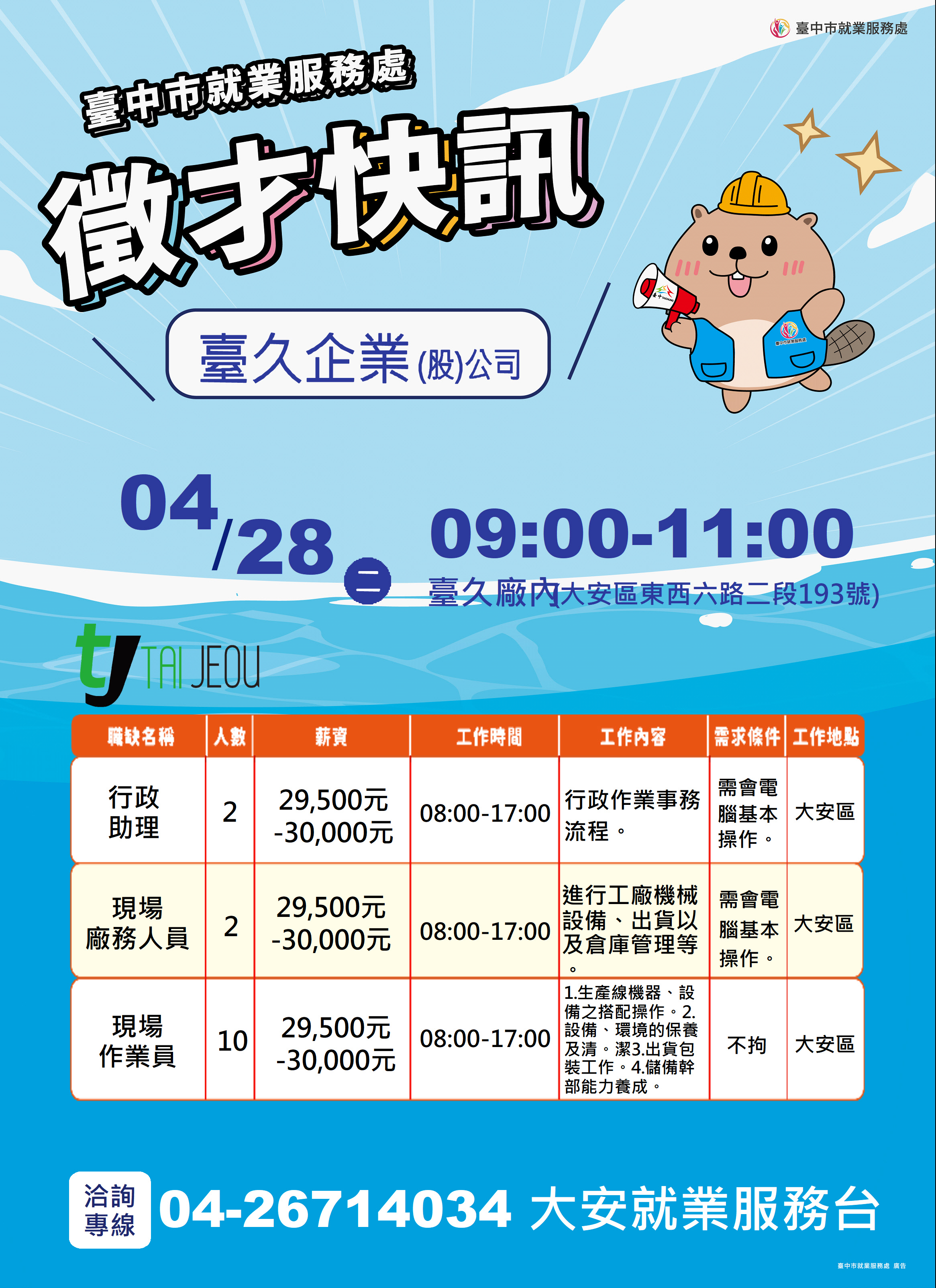 04/28(二)臺久企業股份有限公司單一廠商徵才活動